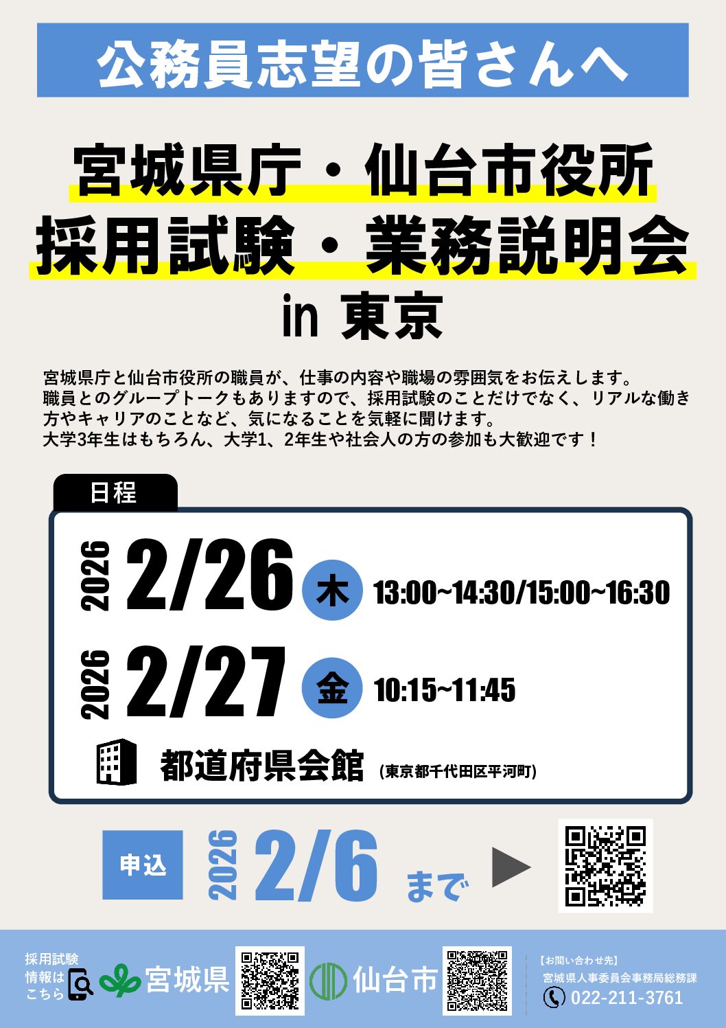 こちらの公務員説明会情報は、団体様のご依頼により掲載させていただいております。情報の修正のご依頼、削除等のご依頼は「公務inお問い合わせフォーム」の詳細にその旨を記載し、送信をお願い致します。