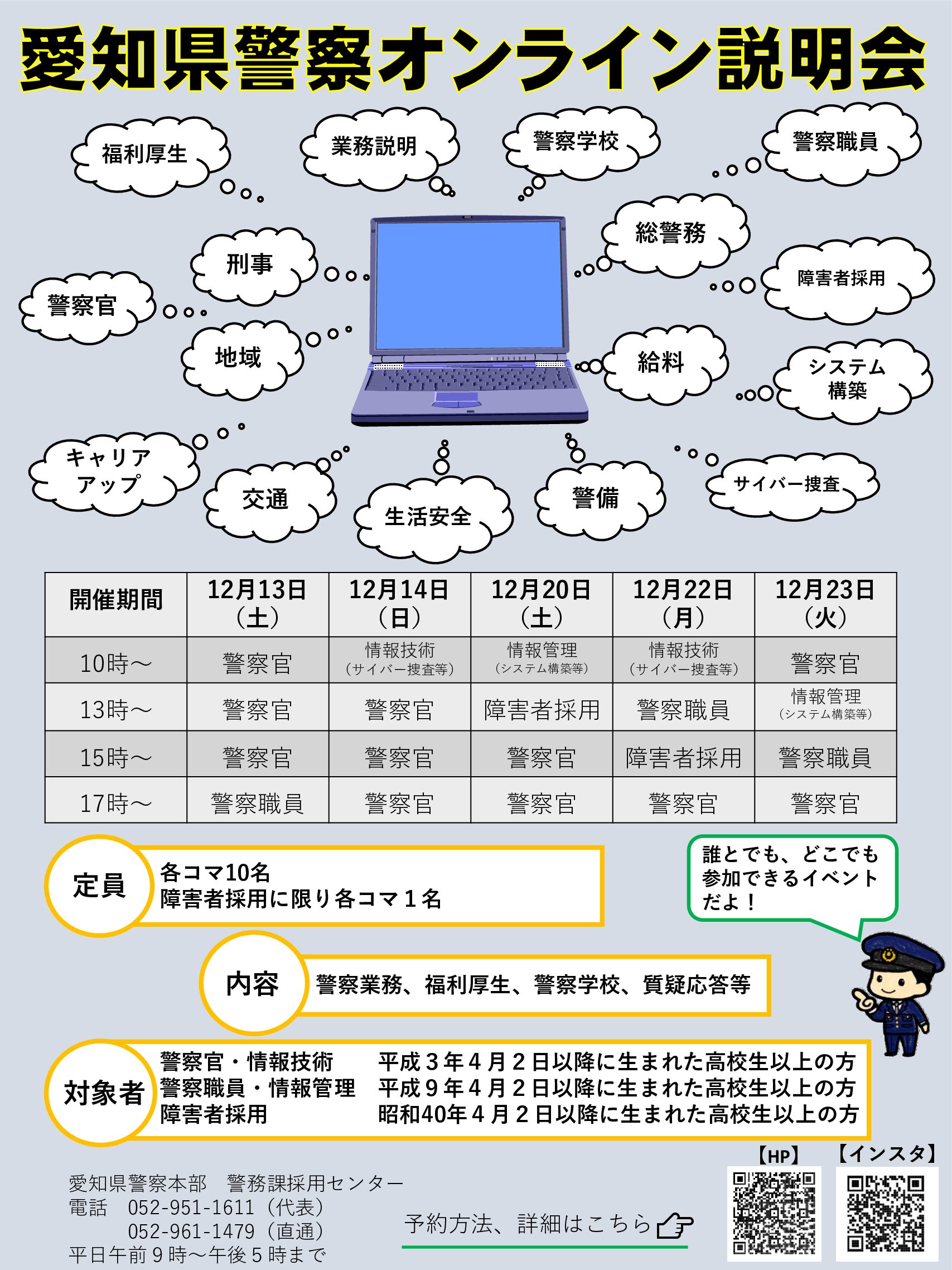| 内容 | 警察の情報通信資機材等の見学や職員との座談会により、警察の技術系職員の仕事を知ることができます。 |